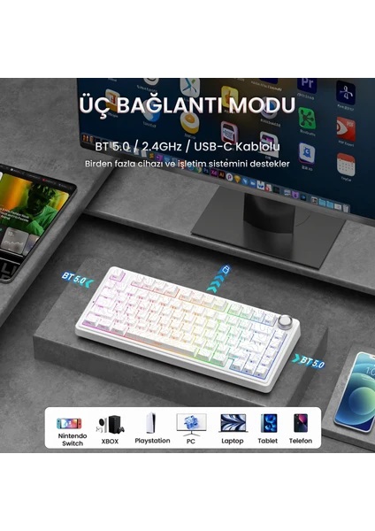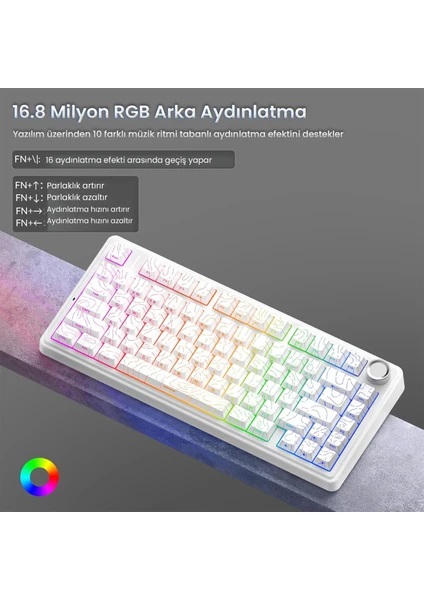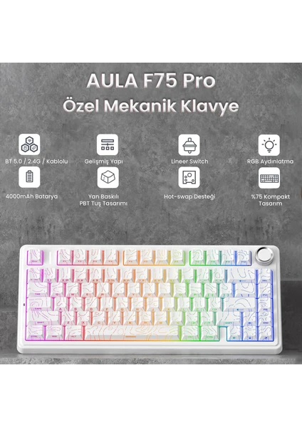 Aula F75 Mekanik RGB TKL Seiya Switch Kablosuz Makrolu Hot Swap Gaming Klavye Desenli Beyaz