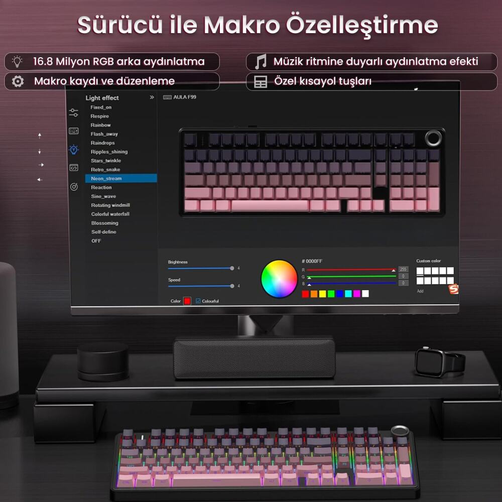 1 x Aula F99 Pro 3 Modlu RGB Hot Swap Mekanik Reaper Switch Kablosuz Makrolu Klavye Gradyan Pembe
