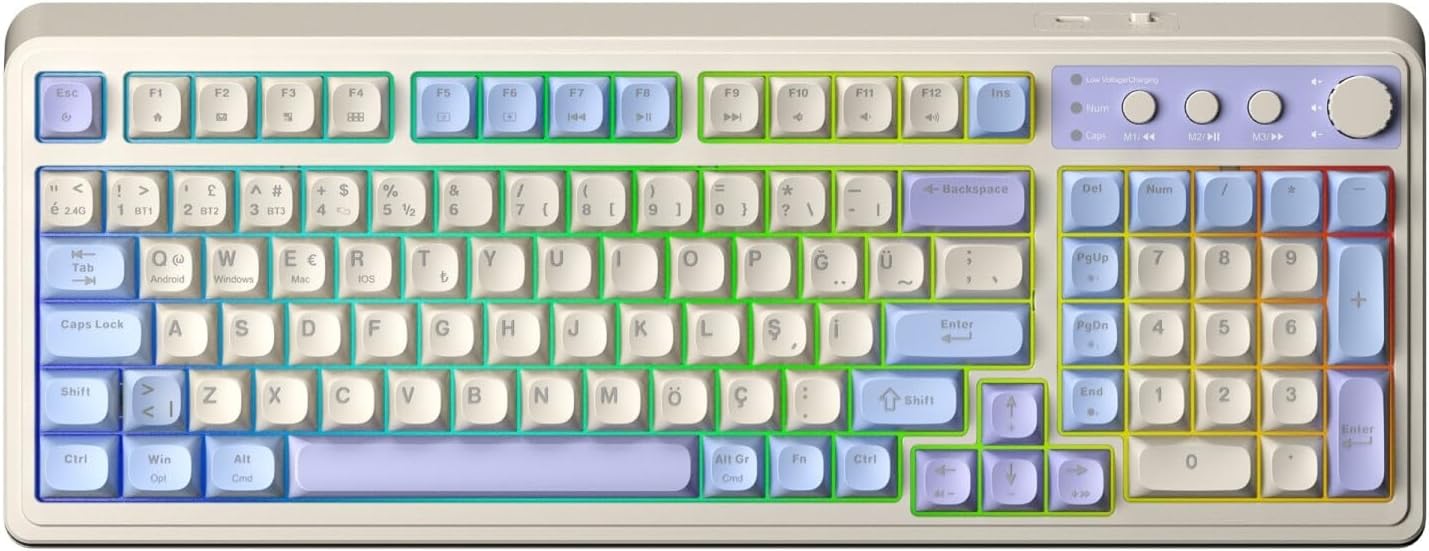 AULA S99 gaming klavye, modern oyuncular için tasarlanmış çok fonksiyonlu bir retro klavye deneyimi sunar. RGB klavye teknolojisi ile donatılmış bu oyun klavyesi, Bluetooth, 2.4GHz kablosuz ve USB-C bağlantı seçenekleri ile her ortamda mükemmel performans sağlar. 100 tuşlu kompakt tasarımı ve sayısal tuş takımı ile hem oyun hem de günlük kullanım için ideal bir klavye çözümüdür.