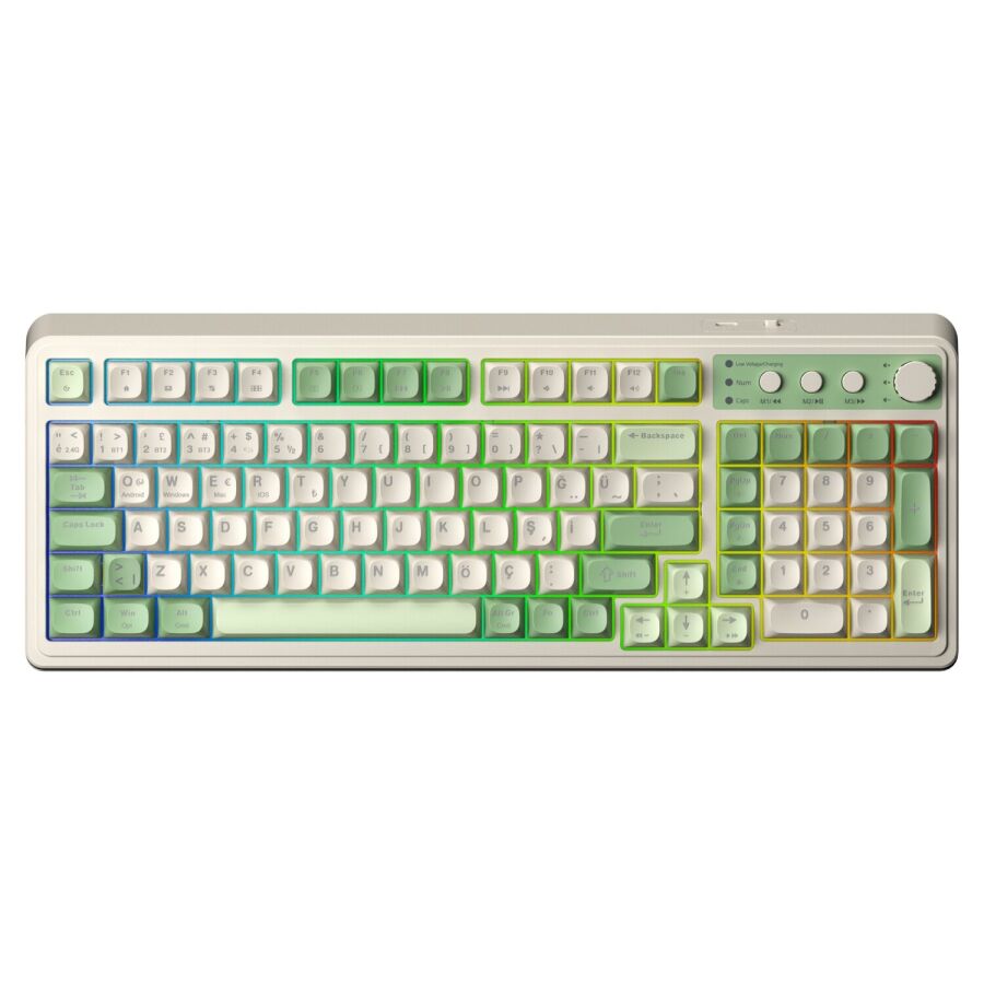 %96 kompakt layout tasarıma sahip bu retro klavye, sayısal tuş takımı ile tanıdık kullanım deneyimi sunar. Kremsi renkli tuş kapakları ile masaüstünüzü güzelleştiren klavye, nostaljik bir dokunuş katar. İki aşamalı katlanabilir destek ayağı ile ergonomik yazım pozisyonu sağlar.