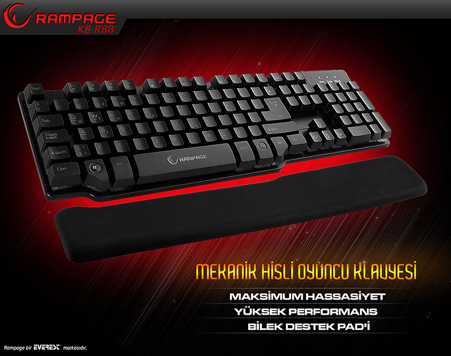 Everest Rampage KB-R88 Siyah USB Mekanik Hisli ve Pad Gaming Q Klavye ; Bilgisayar dünyasında birçok başarılı aksesuara imza atan Everest, kitlesi günden güne çoğalan oyuncularıda ihmal etmiyor. Firmanın Rempage KB-R88 olarak adlandırdığı klavye, dışarıdan bakıldığında tipik oyuncu klavyelerinden çok farklı bir görünüme sahiptir. Oyunlar sırasında tamamen oyuncuların oyun zevki düşünerek tasarlanmış olan mekanik hisli tuşlar ile oyun oynamanın keyfine varın. Bileklik için tasarlanmış ergonomik bilek pad'i de klavyenizi kullanırken sizi rahat ettirecek.