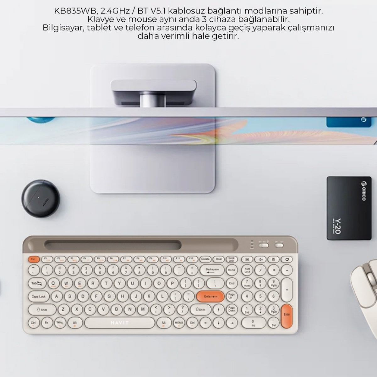 KB835WB, ofis ve çoklu cihaz kullanımı için tasarlanmış sessiz, ince ve şarj edilebilir klavye-mouse setidir. 2.4GHz + Bluetooth 5.1 bağlantısıyla aynı anda 3 farklı cihaza bağlanabilir. Sessiz tuş vuruşları ve taşınabilir yapısıyla çalışmanızı daha konforlu ve verimli hale getirir.