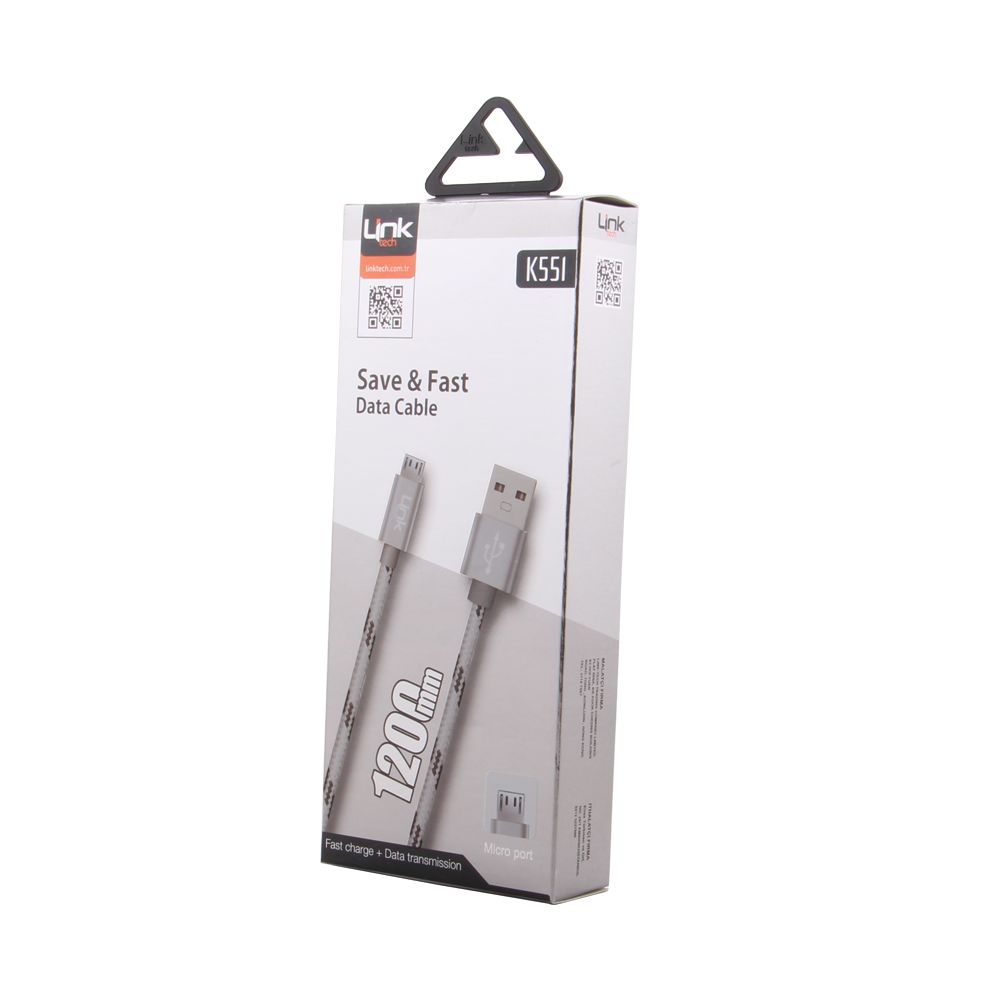 Örgülü kablo yapısı ve dayanıklı uçlarıyla dikkat çeken Micro USB uyumlu K551 data ve şarj kablosu 1200 mm uzunluğa sahip. Kablonun siyah, gri ve pembe renkleri bulunuyor.