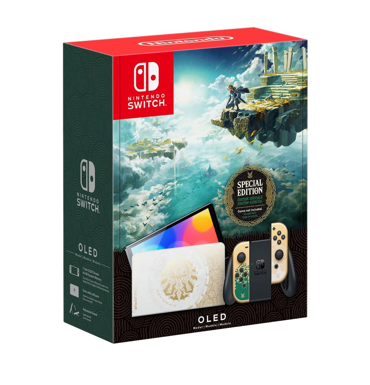 Nintendo Switch – OLED Modeli - The Legend of Zelda: Tears of the Kingdom Edition, The Legend of Zelda: Tears of the Kingdom'dan (ayrı satılır) özel bir tasarıma sahiptir ve Legend of Zelda serisinden tanıdık Hylian Crest de dahildir. iskelenin önü.