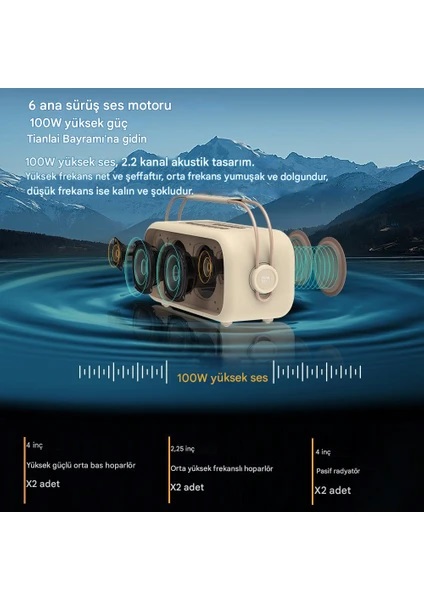 100W Bluetooth hoparlör, evinize karaoke alanı getirmek için özel olarak tasarlanmış çok yönlü bir ses cihazıdır. En sevdiğiniz müziği kolayca dinlemek için hoparlörü cep telefonunuza, tabletinize veya Bluetooth özellikli başka bir cihaza bağlayabilirsiniz. 2 karaoke mikrofonunu destekleme özelliği sayesinde özgürce şarkı söyleyebilir ve gerçek bir yıldız gibi performans sergileyebilirsiniz.
