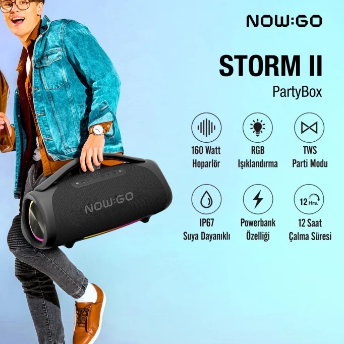 Cevap: Kesinlikle, NowGo Storm II IP67 sertifikalı olup su ve nem koşullarına karşı üstün dayanıklılık gösterir. Bu özellik sayesinde plaj etkinlikleri, havuz kenarı eğlenceleri veya yağışlı dış mekan aktiviteleri için mükemmel bir parti hoparlörü seçimidir.