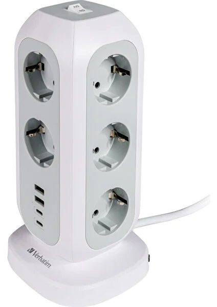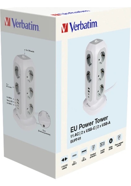 Verbatim EU Güç Kulesi, bir Avrupa tipi prizi 11 AC prize ve ayrıca iki USB-C bağlantı noktasına ve iki USB-A bağlantı noktasına genişletebilir. 2 m uzatma kablosuna sahip bu çoklu fiş, cihazlarınızı şarj edilmiş ve tam güçle çalışır durumda tutmak için ihtiyacınız olan tüm prizleri sağlar.
